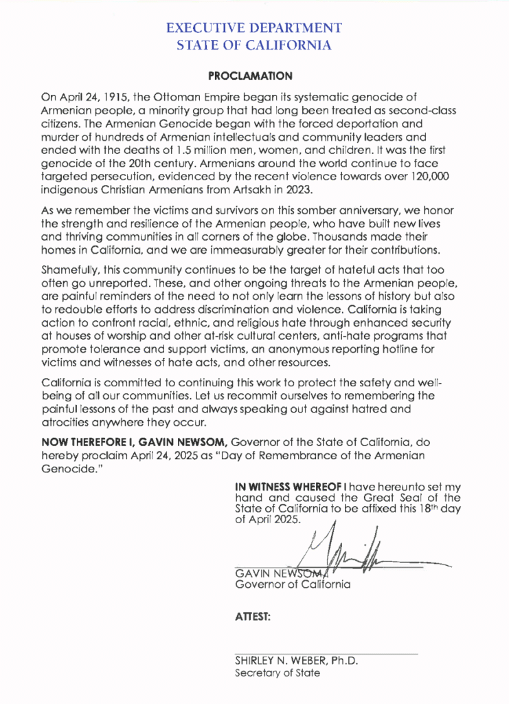 Կալիֆոռնիայի նահանգապետ Գևին Նյուսոմը պաշտոնապես հայտարարել է 2025 թվականի ապրիլի 24-ը որպես Հայոց ցեղասպանության հիշատակի օր՝ ի հիշատակ Օսմանյան Թուրքիայի կողմից իրականացված ցեղասպանության ավելի քան 1.5 միլիոն անմեղ զոհերի: